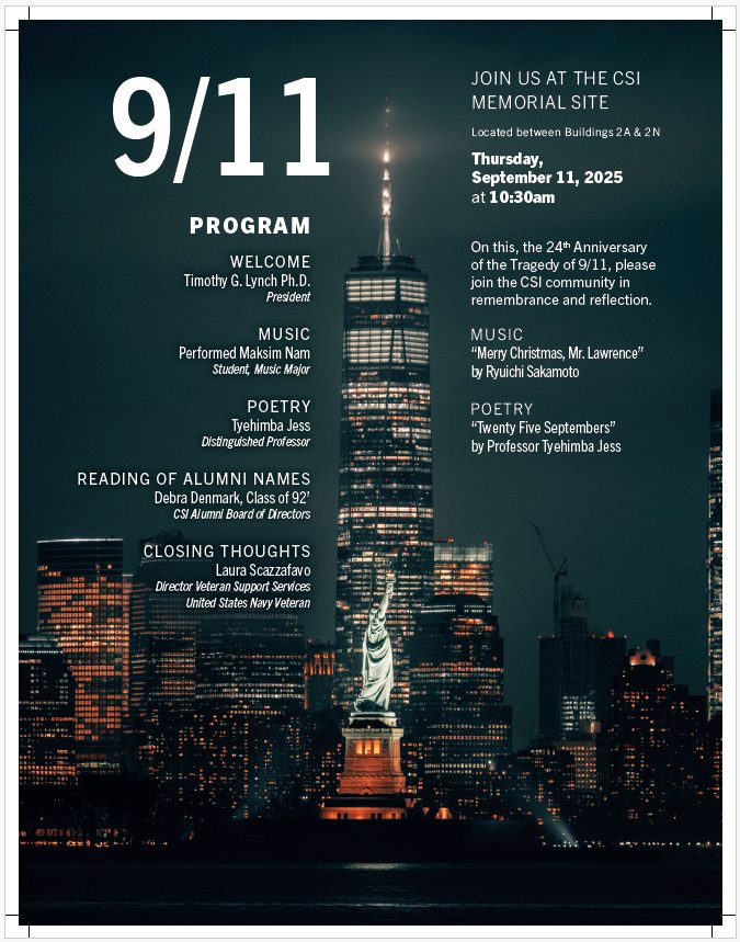 You are invited to join the CSI community in remembrance and reflection at the CSI Memorial Site on Thursday, Sept. 11.at 10:30am on what will be the 24th Anniversary of the Tragedy of Sept. 11.