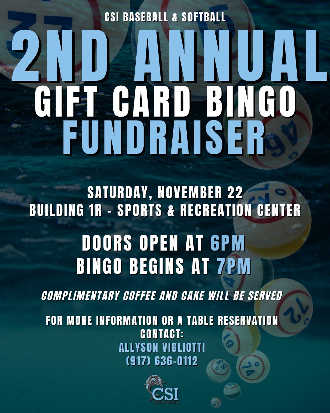 The College of Staten Island Baseball and Softball programs are inviting the community to come together for a fun-filled evening at the 2nd Annual Gift Card Bingo Fundraiser, benefiting their programs. The event will be held on Saturday, November 22 at Building 1R – Sports & Recreation Center. Doors open at 6:00 PM, and the bingo action kicks off at 7:00 PM.