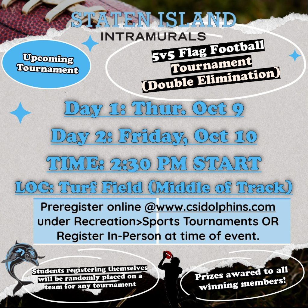 Upcoming Sports Tournaments: Our 5v5 Flag Football tournament Day 1 is scheduled for Thursday, Oct 9, 2:30 PM START on the Turf Field (Middle of Track).
