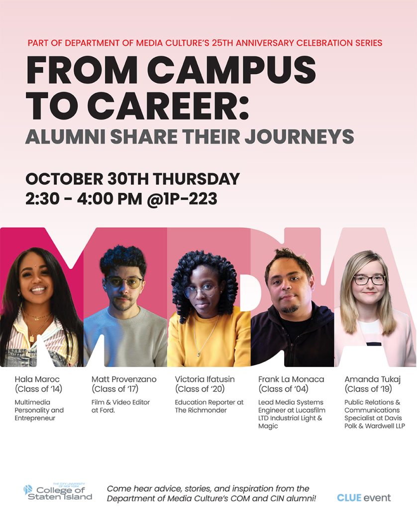 As part of the Department of Media Culture’s 25th Anniversary Celebration Series, CSI will host “From Campus to Career” — an engaging alumni panel discussion that highlights the professional paths of Media Culture graduates who have successfully translated their classroom experiences into thriving careers across the media landscape.