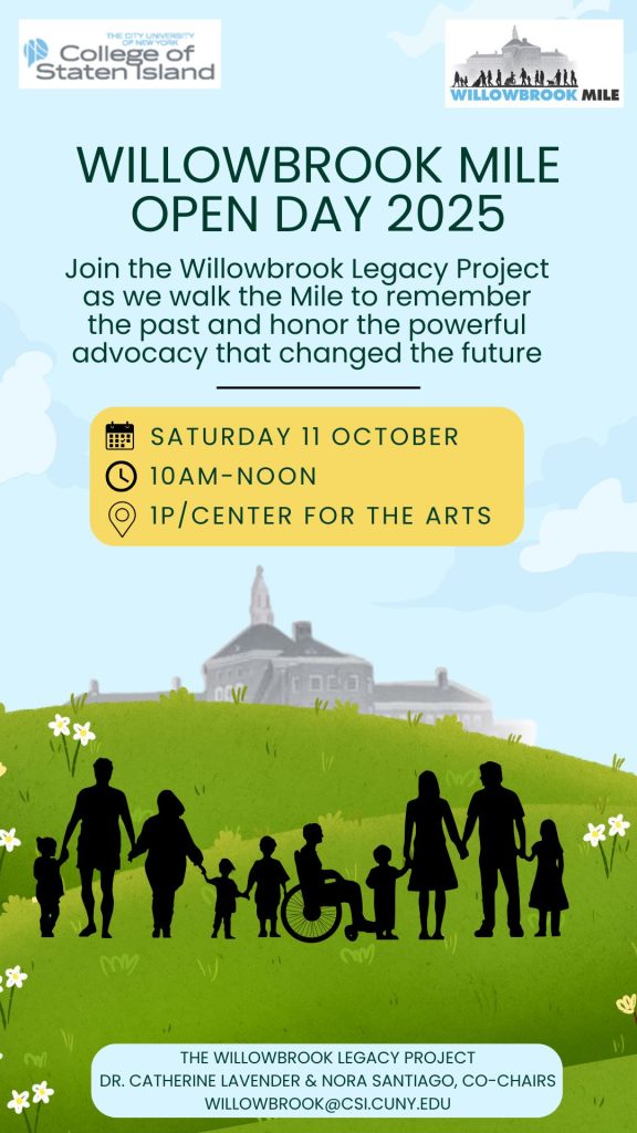 Please join the Willowbrook Legacy Project for the Willowbrook Mile’s Open Day 2025, our annual commemoration of the history of the College of Staten Island’s campus on the site of the former Willowbrook State School. The Open Day will be held on Saturday, October 11, 2025, from 10am to noon at the CSI campus (2800 Victory Boulevard) with the Center for the Arts/1P as its home base. The Mile encompasses 2.1 miles of walking trails with informative historical Milestones on the beautiful CSI grounds, as well as forays onto the sites of the Institute for Basic Research and the Office for People with Developmental Disabilities (OPWDD). Maps of the Mile will be available at 1P.