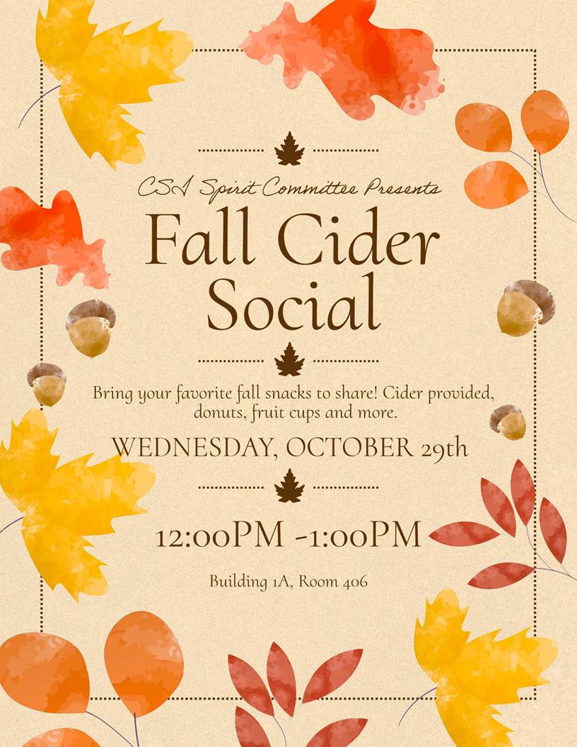 You’re Iinvited to the CSI Spirit Committee Fall Cider Social on Wednesday, Oct. 29 in Building 1A, Room 406 from noon to 1:00pm. More information is available online.