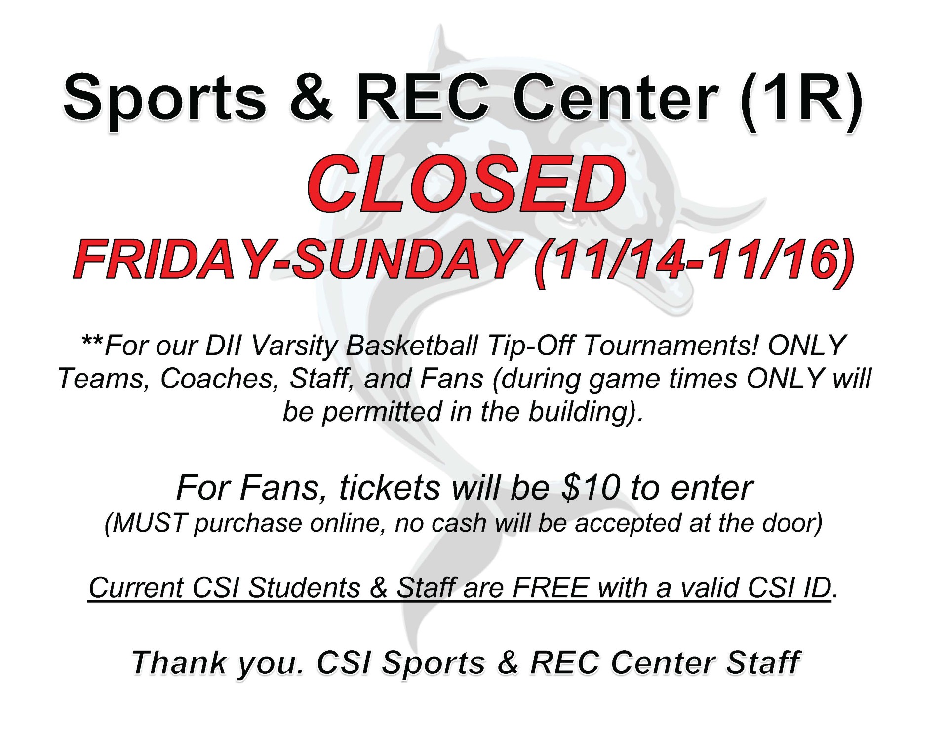 The Sports and Recreation Center (Building 1R) will be closed from Friday to Sunday, Nov. 14 to 16. More information is available online.