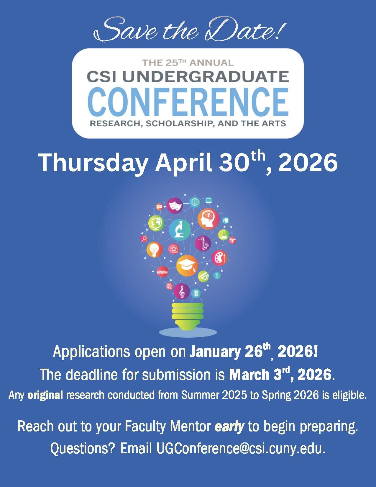 As we move toward the end of the fall semester, I wanted to write and request that you save the date for the 2026 Undergraduate Conference on Research, Scholarship, and the Arts. Its scheduled for Thursday, Apr. 30, 2026. More information is available online.