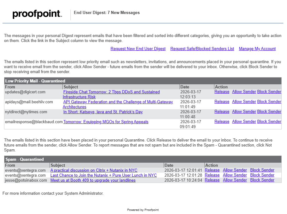 To combat increasingly sophisticated phishing and other email-based attack campaigns, CUNY is mandating that all campus mail servers raise the security level for inbound threat detection. As a result, some legitimate emails may be flagged by these enhanced filters and moved to your quarantine folder. You can release, allow sender, or block sender messages directly from the “Email Quarantine” email you receive with the subject line “End User Digest: # New Messages.” A sample of the digest is online.