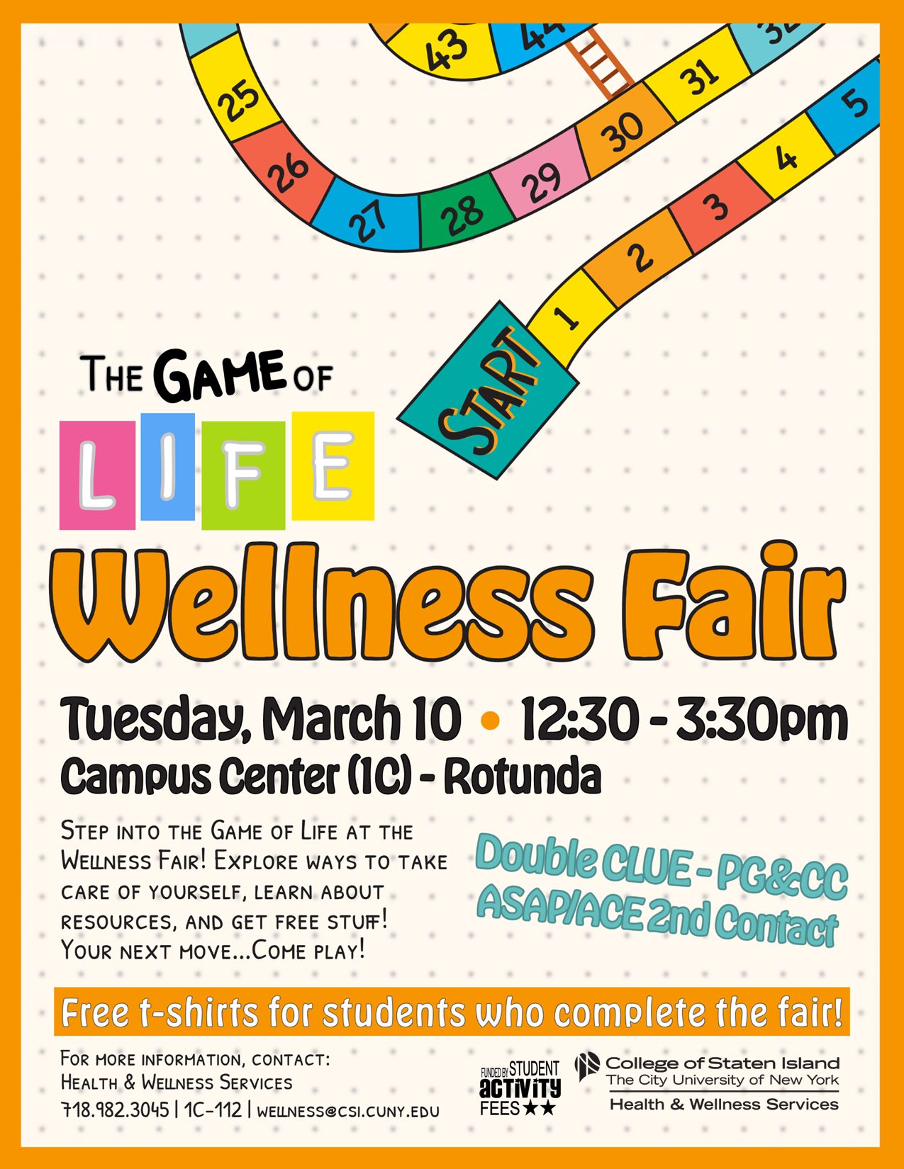 Please join Health and Wellness and more than 20 campus and community partners for The Game of Life: Wellness Fair, happening tomorrow, Tuesday, Mar. 10 in the Campus Center (Building 1C) Rotunda from 12:30pm to 3:30pm.