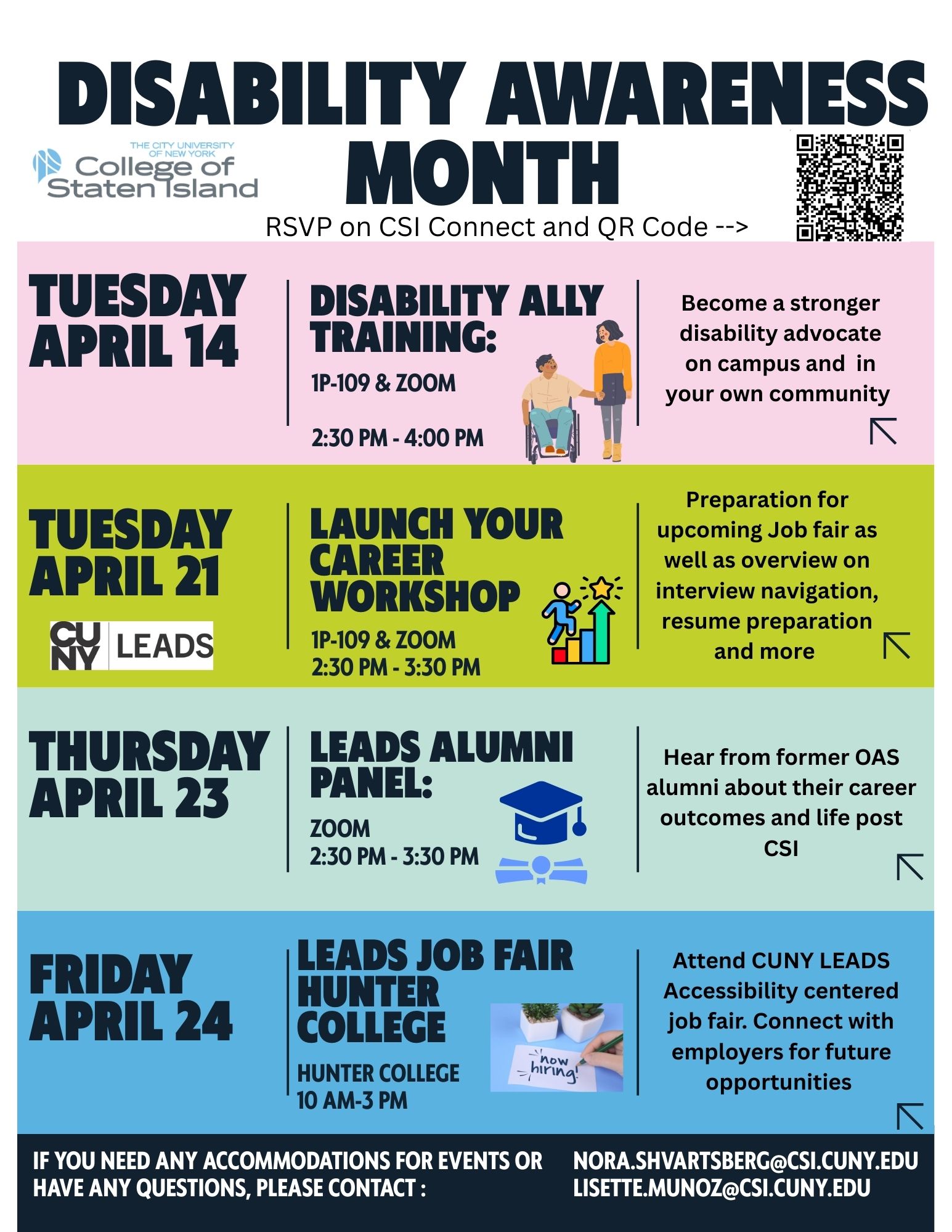 The Office of Accessibility Services will have several meaningful events for CUNY Disability Awareness Month starting on Tuesday, Apr. 14 during Club Hours—2:30pm to 4:00pm. Events will be held both in-person and via Zoom. For those attending in person, events will be located in the Center for the Arts (Building 1P), Room 109.